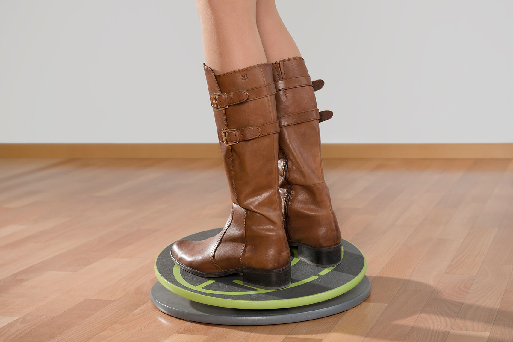 - Teilnehmerin steuert durch kontrollierte Bewegung der Platte unter ihren Füßen das Objekt am Bildschirm