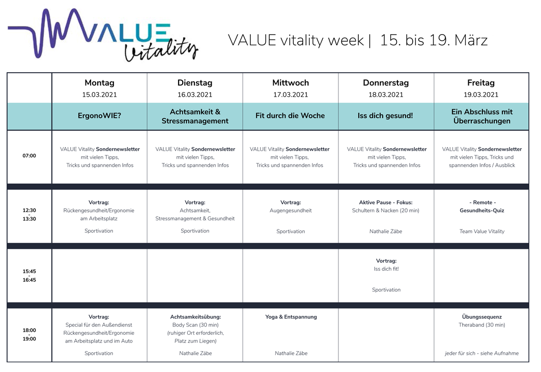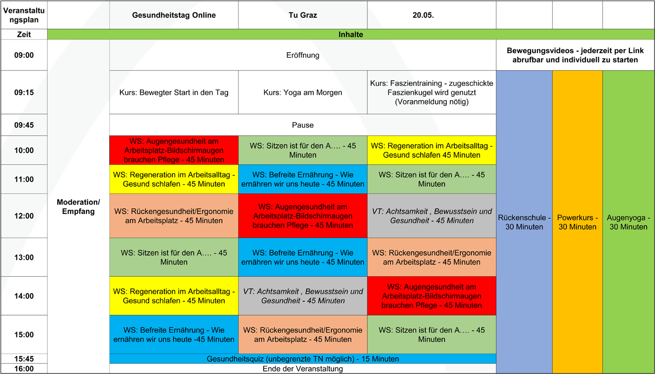 Ein Tag voller Gesundheit für Sie und Ihre Mitarbeiterinnen geht auch online. Neben Vorträgen und Seminaren können wir für Sie auch Kurse, Challenges und Beratungen im Rahmen eines Online Gesundheitstags durchführen. Im gemeinsamen Austausch kann sogar der Arbeitsplatz analysiert und ansprechend gestaltet werden.
